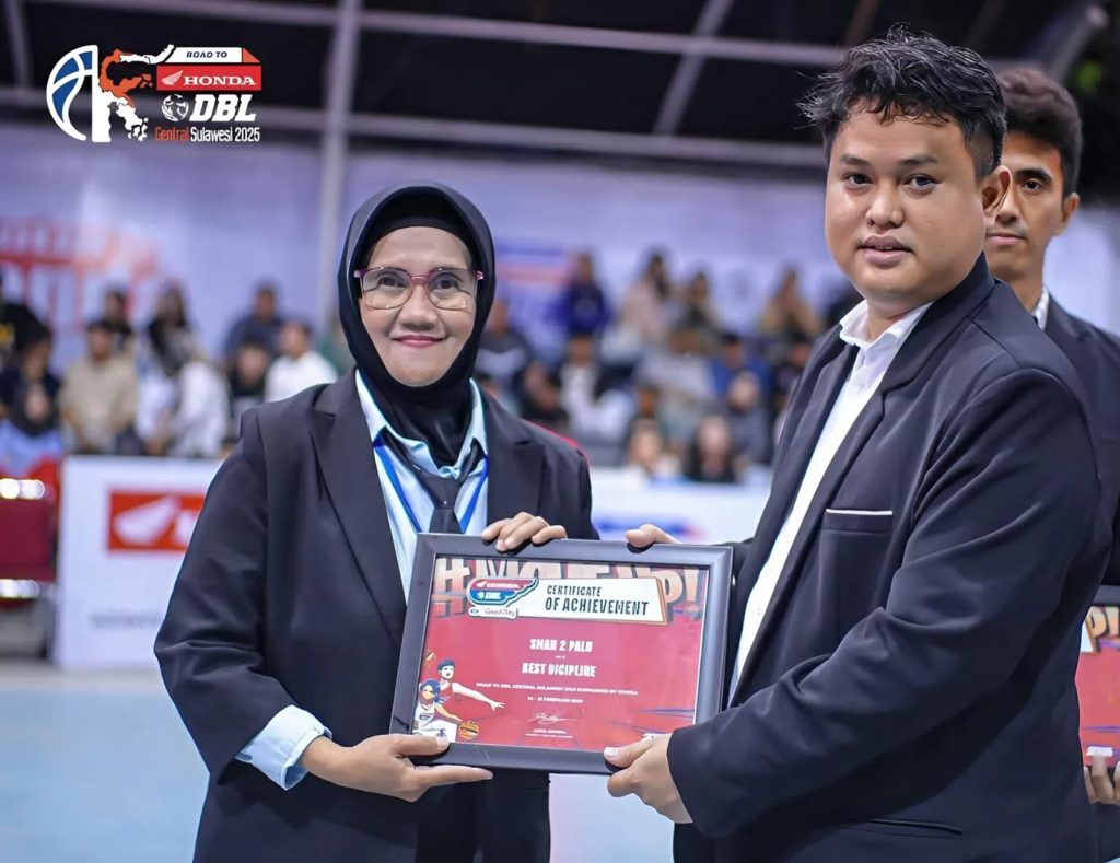 Wahyu Nugraha saat menyerahkan piagam penghargaan kepada SMA Negeri 2 Palu pada rangkaian acara Road to DBL Sulawesi Tengah.