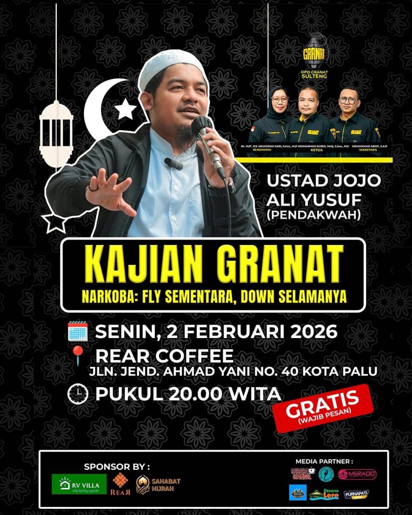 Palu – Ustaz Jojo Ali Yusuf, yang akrab dengan julukan “Ustadz Grind Boys”, siap berbagi kisah inspiratif hijrahnya dari dunia narkoba dan kehidupan malam menuju jalan dakwah. Acara ini akan digelar pada Senin, 2 Februari 2026, pukul 20.00 WITA di Rear Coffee, Jalan Ahmad Yani, Kota Palu, dan terbuka untuk umum secara gratis.